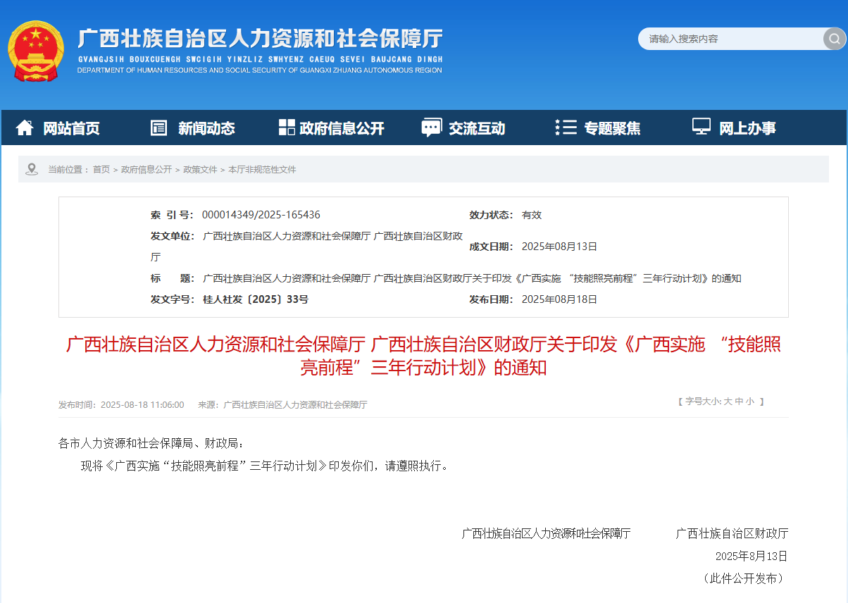 从2025年起至2027年底,围绕广西“1+19”(人工智能+19个千亿级支柱产业)现代化产业体系,统筹使用就业补助资金、职业技能提升行动专账资金、企业职工教育经费等资金,以高校毕业生等青年群体、农村转移就业劳动者、登记失业人员、就业困难人员等重点群体为核心对象,充分发挥技工院校技能人才培养优势,大规模开展职业技能培训。大力推行“岗位需求+技能培训+技能评价+就业服务”四位一体项目化培训模式,促进培训与就业紧密协同,实现开展补贴性职业技能培训60万人次以上。