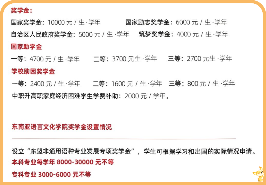 广西外国语学院构建了“奖、助、贷、补、免”全方位资助体系,涵盖从入学到毕业的全过程。家庭经济困难学生可通过入学资助、助学贷款解决学费问题,通过国家助学金、勤工助学保障生活,优秀学子还可争取国家奖学金、励志奖学金等荣誉。祝大家学业顺利!