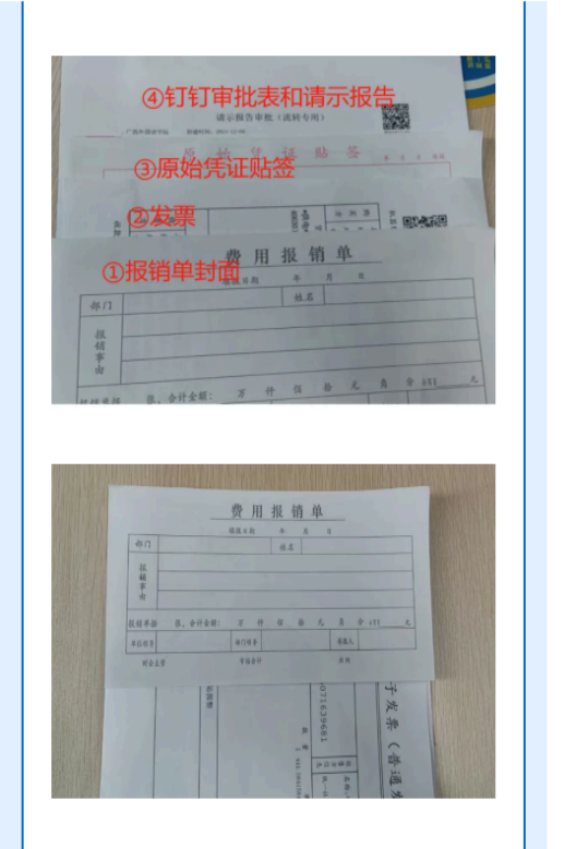报销单封面→发票→原始凭证贴签→钉钉审批表和请示报告,按此顺序整理好后,所有票据资料对齐左上角用胶水粘贴整齐,让报销单“颜值”与“规范度”双在线,财务审核更高效。